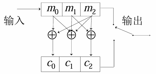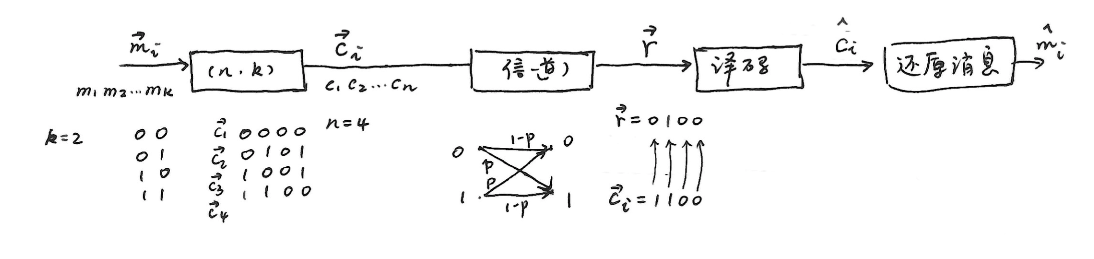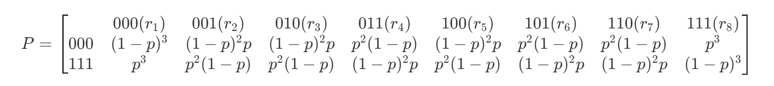 - 采用简单重复编码,\(k = 1\) ,\(n = 3\) ,则\(0\rightarrow000\)(\(\vec{C_{1}}\)),\(1\rightarrow111\)(\(\vec{C_{2}}\))