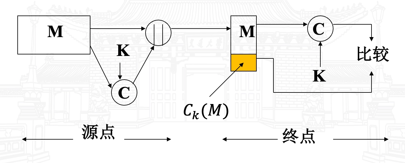 - 密钥与消息同时参加运算: \[ KeyedHash = \mathbf{Hash}(Key \parallel Message) \]