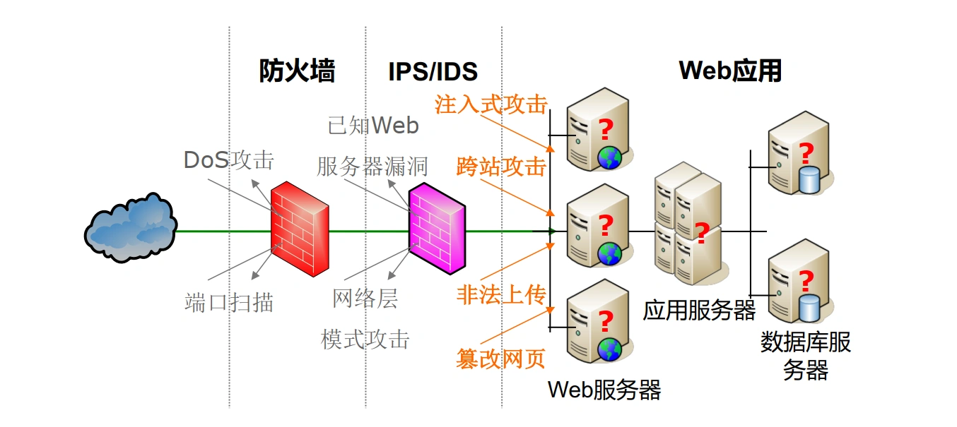 - 分布式拒绝服务攻击(DDoS):海量垃圾流量淹没目标,导致合法用户无法访问服务。