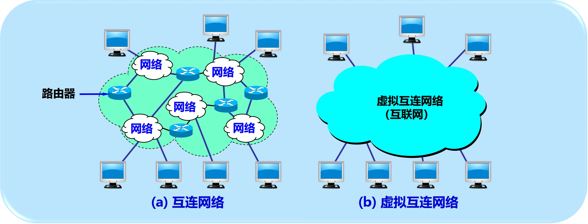 - Internet(互联网、因特网):专有名词,指全球范围的众多网络互连而成的特定的互连网,采用 TCP/IP 协议族。互联网的两个重要基本特点是连通性和资源共享,是 Internet 提供诸多服务的基础。