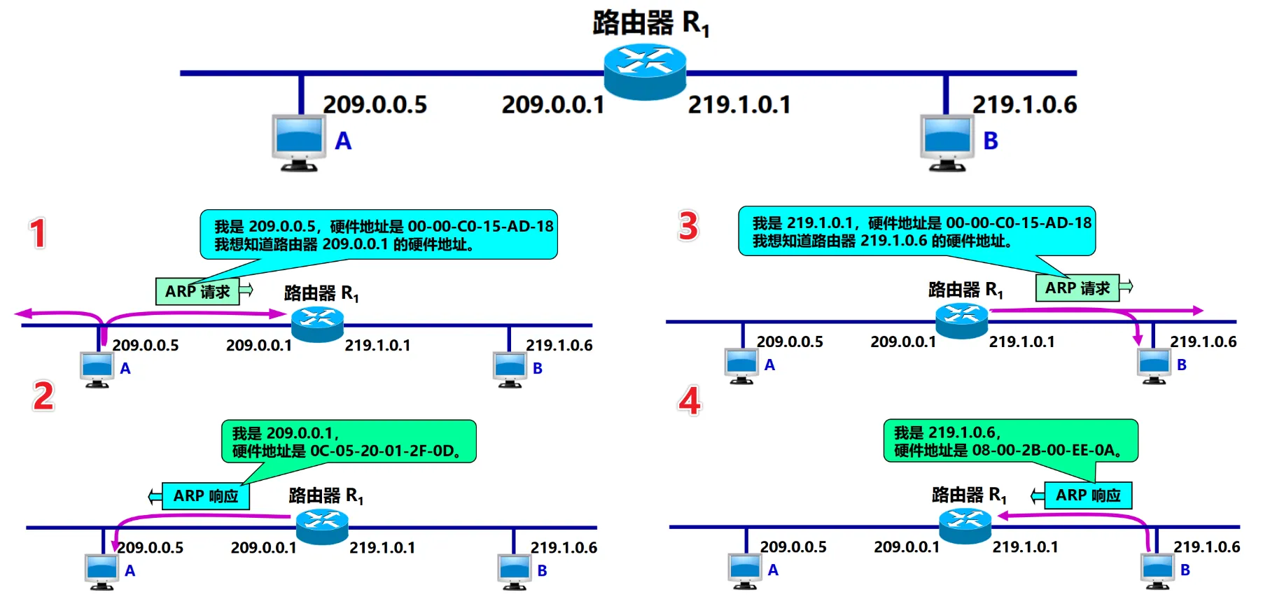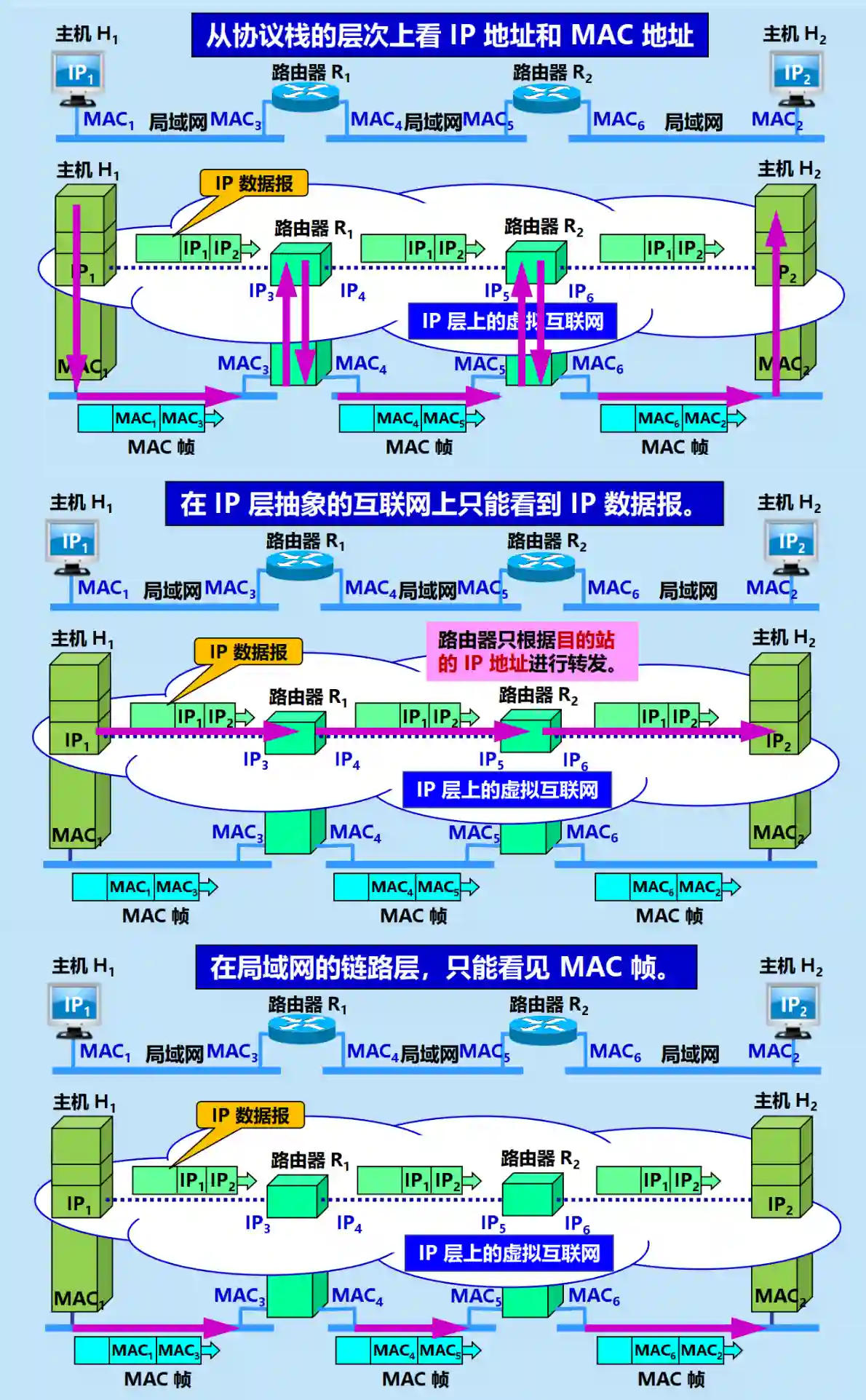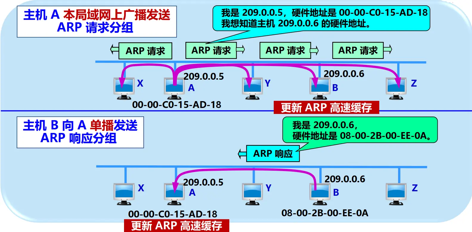 - ARP(地址解析协议):无连接,局域网内的地址映射协议,通过广播请求将目标 IP 地址转换为对应的 MAC 地址,实现链路层寻址。