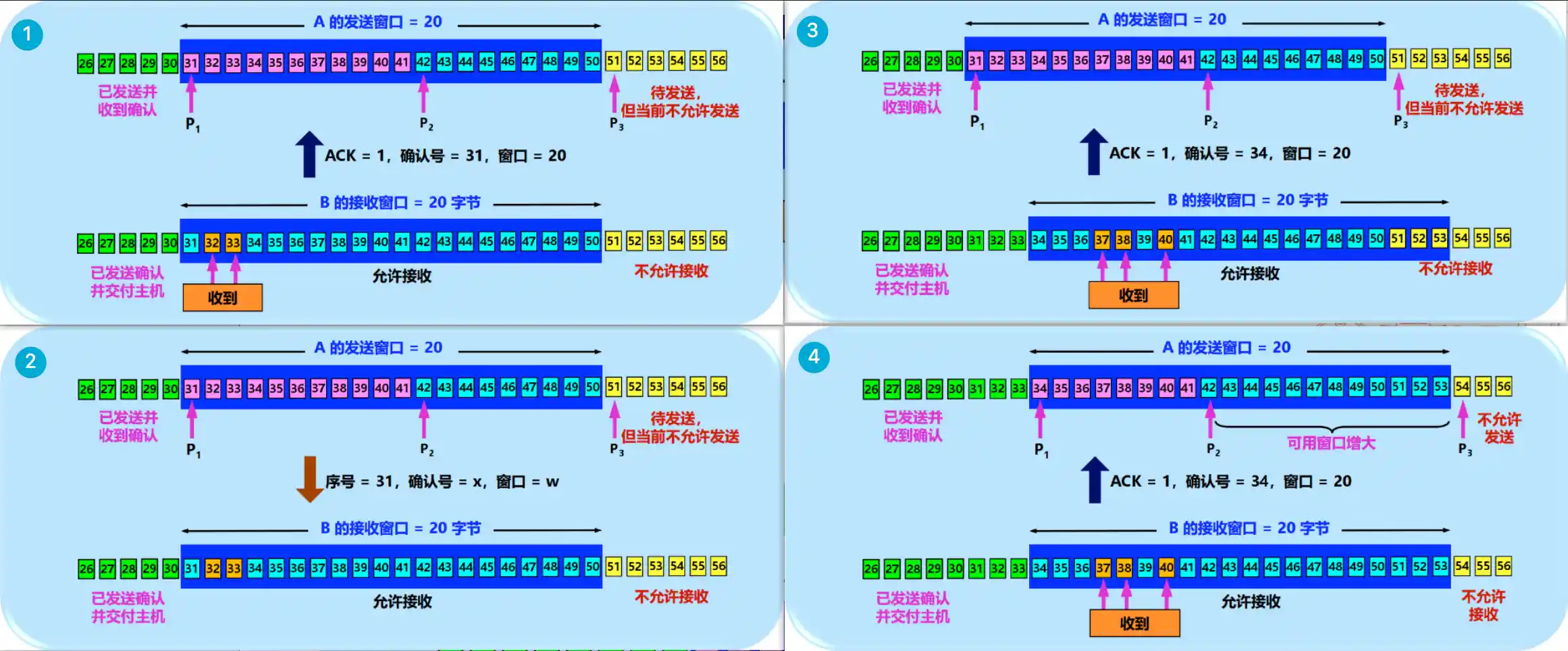 - GBN-ARQ(后退 N 帧 ARQ 协议):滑动窗口型可靠数据传输协议,允许发送方连续发送多个数据包,接收方按序确认,适用于中等延迟和误码率的通信环境。