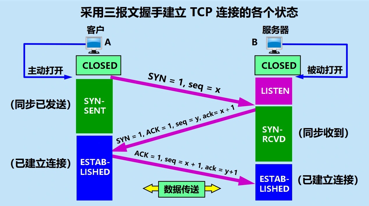 - TCP(传输控制协议):有连接,面向连接的可靠传输协议,通过三次握手建立连接,提供确认、重传、排序、流量控制等机制,保证数据的完整、有序传输。