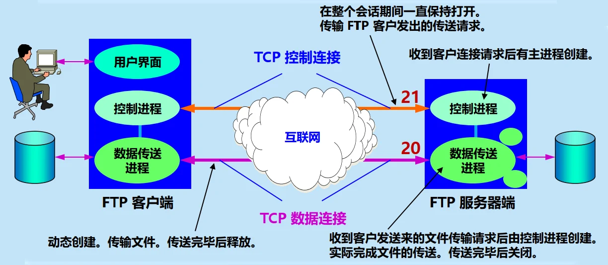 - FTP(文件传输协议):基于 TCP,有连接,面向连接的文件传输协议,通过控制连接和数据连接分离的方式,实现可靠的文件上传、下载和管理。