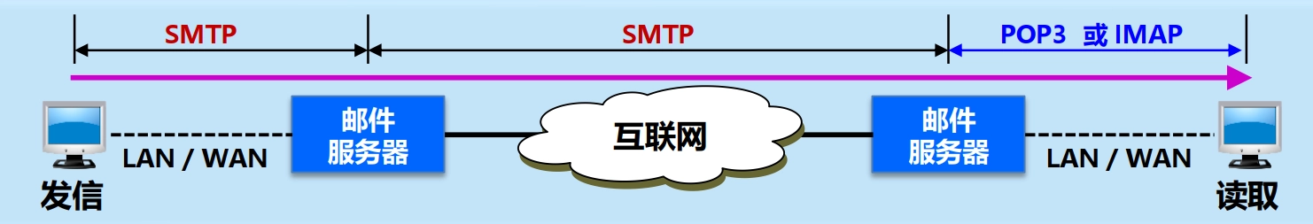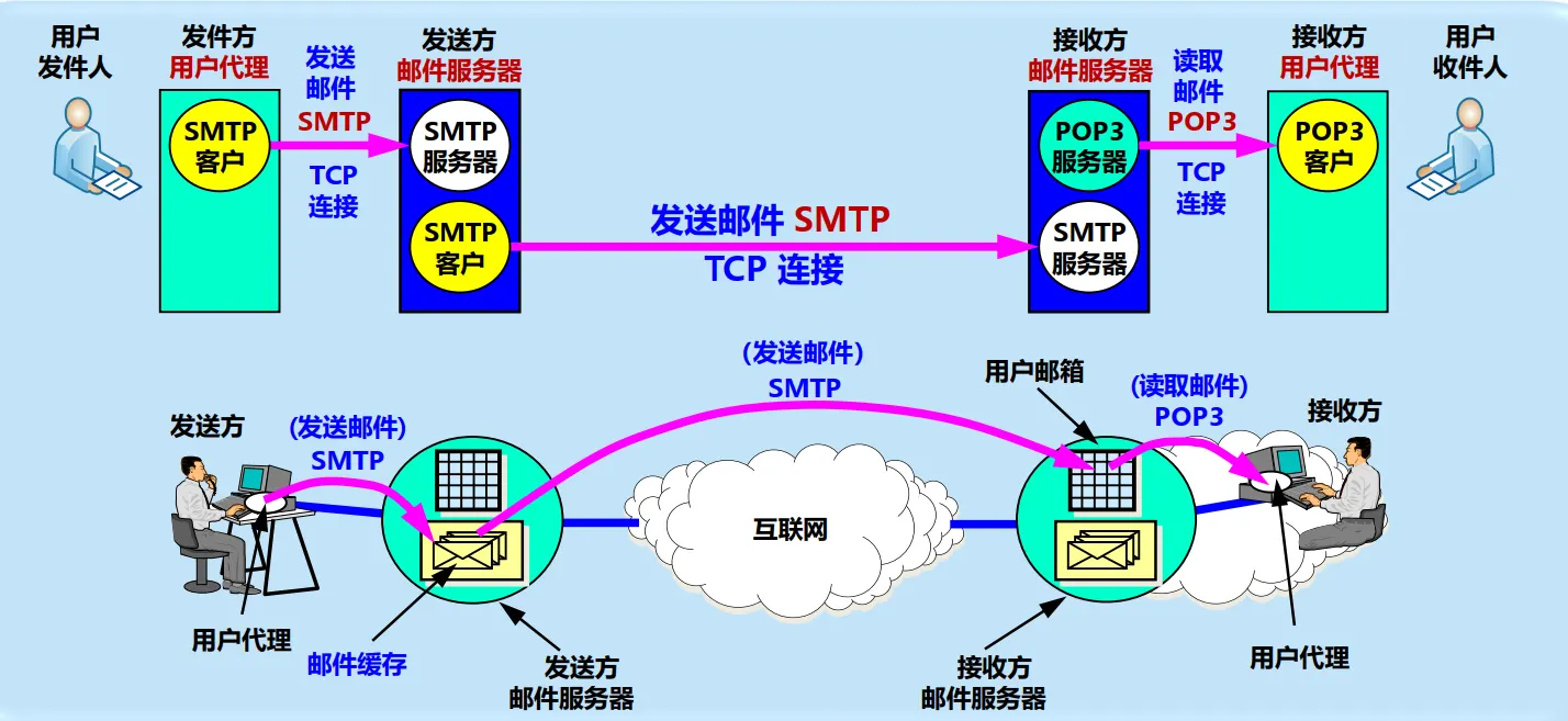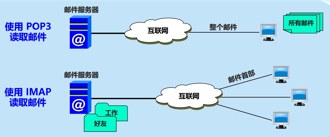 - POP3(邮局协议第3版):基于 TCP,有连接,电子邮件接收协议,采用“下载后删除”的模式,将邮件服务器的邮件下载到本地客户端。