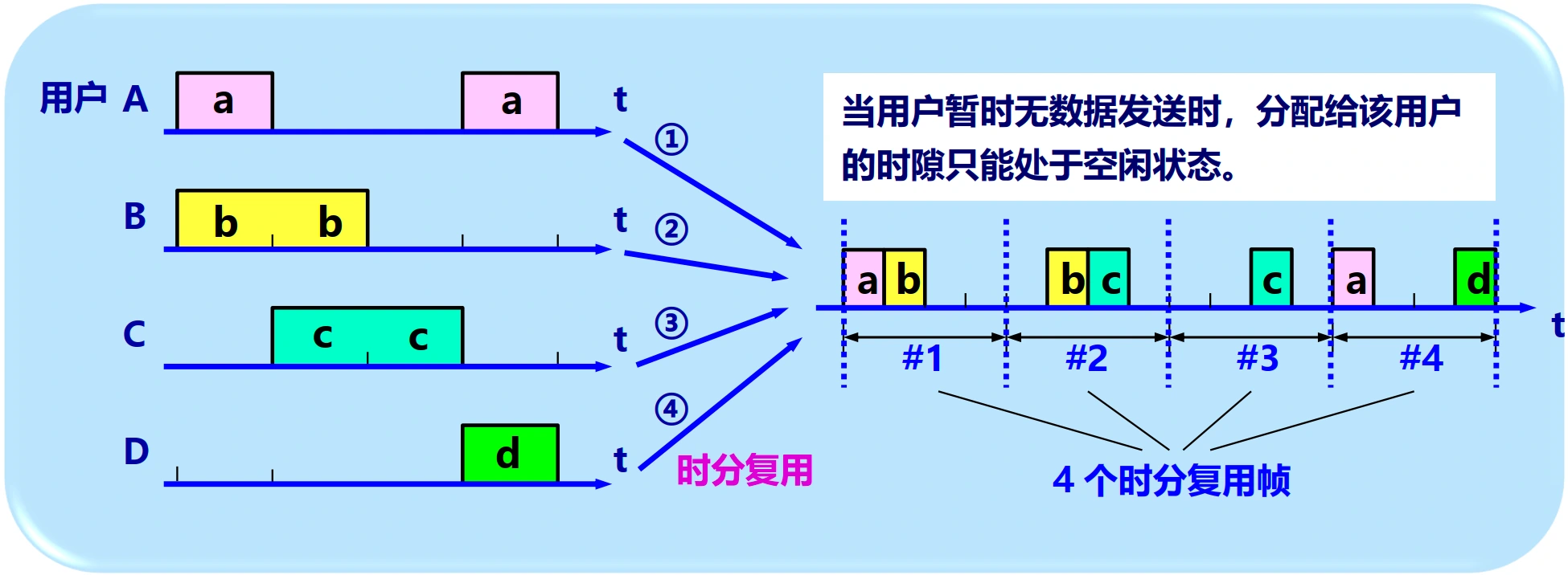 - 把可用频带(上行和下行各占用 25 MHz)划分为 125 个带宽为 200 kHz 的子频带,再把每个子频带进行时分复用,每个 TDM 帧划分为 8 个时隙。每个通话的用户占用一个 TDM 帧中的一个特定时隙。