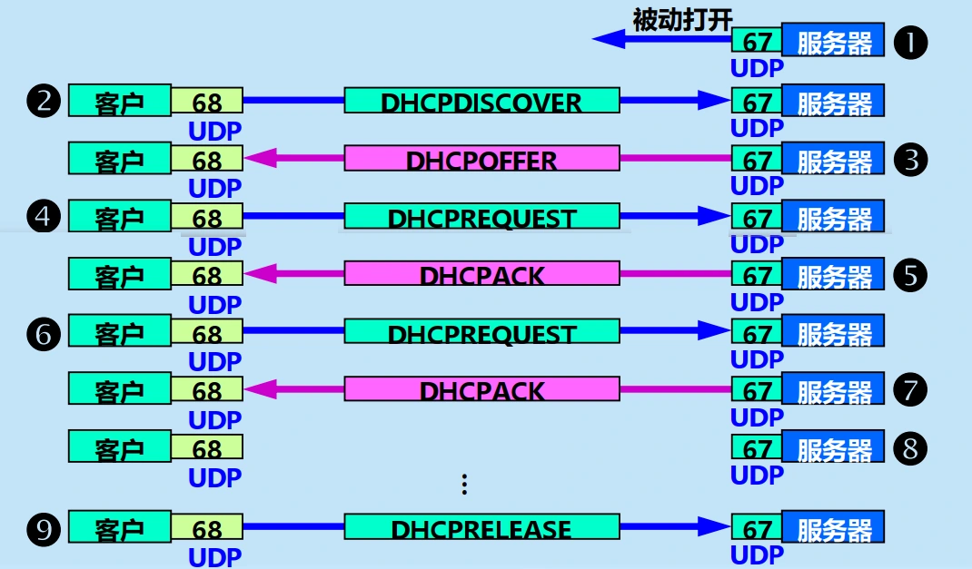 - DHCP(动态主机配置协议):基于 UDP,无连接,IP 地址自动分配协议,通过广播方式为局域网内设备自动分配 IP 地址、子网掩码、网关等网络参数。
