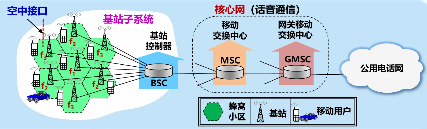 - GSM:包括基站子系统和网络子系统(常称为核心网)。