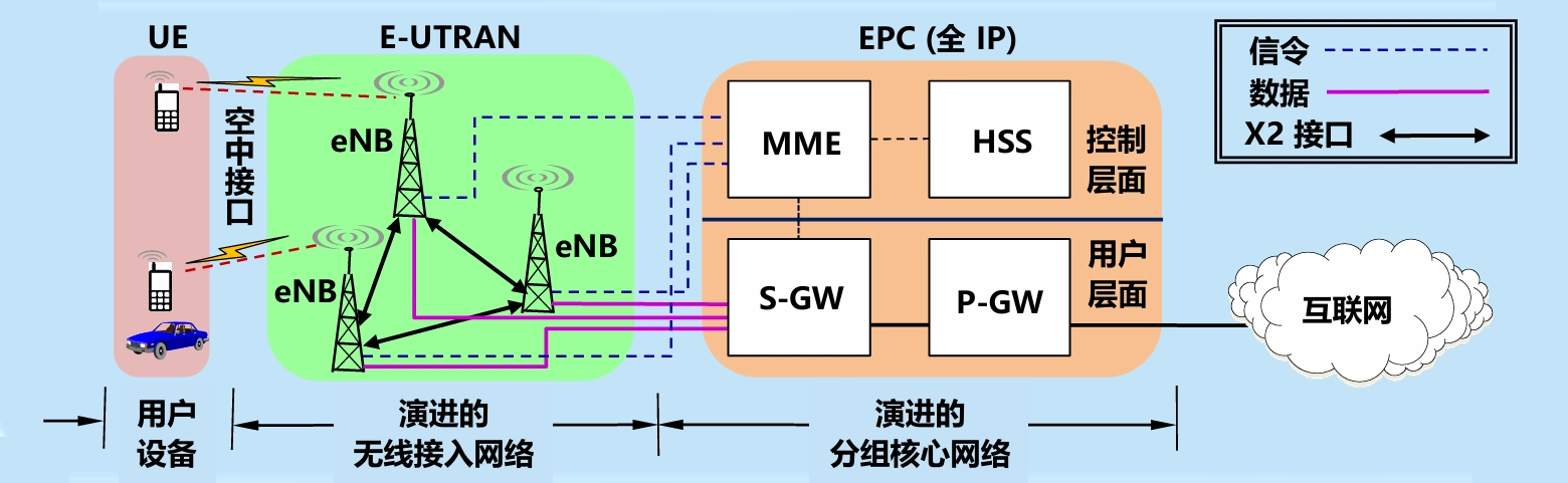 - 控制层面:基站 eNB 连接 MME 和 HSS,处理 UE 的登记、切换、呼叫、寻呼等信令消息。