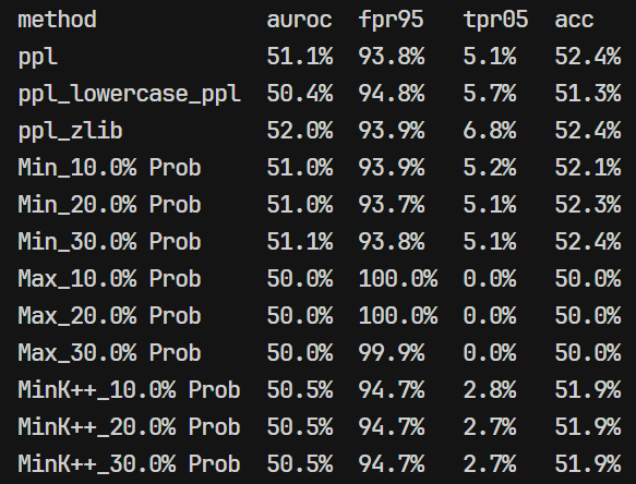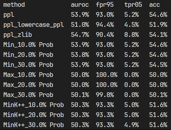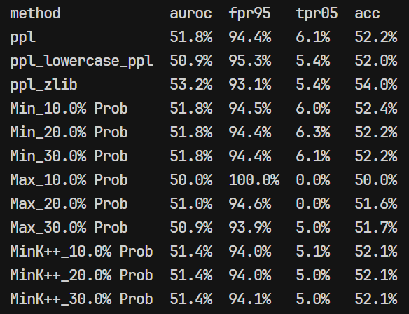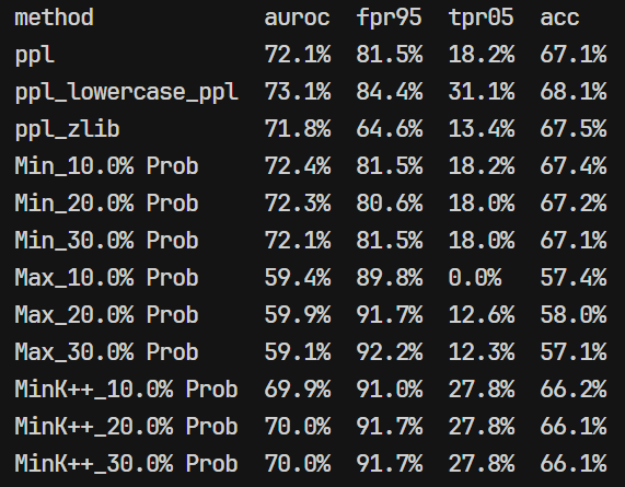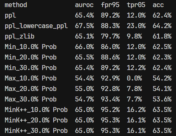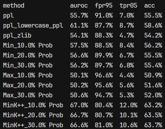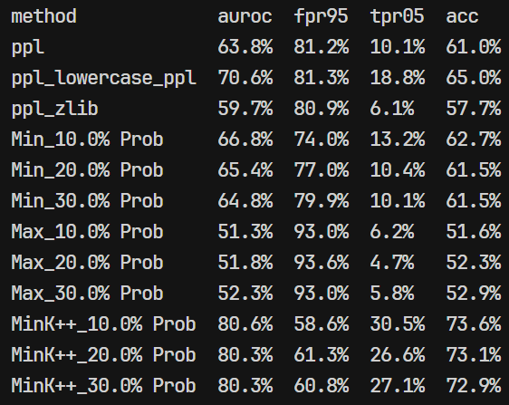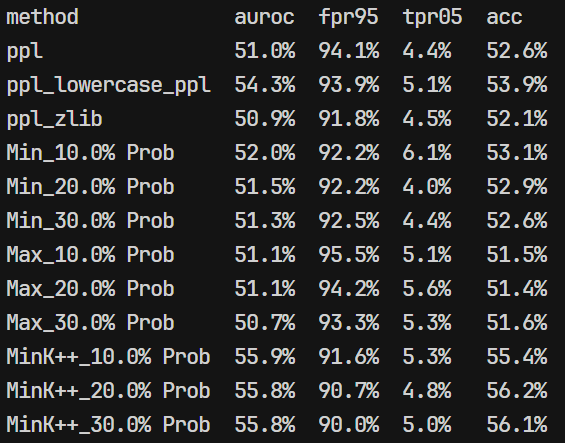 - 复现的时候发现看起来用的 MIA 算法是:基于困惑度、基于概率分析(MIN-K/MAX-K/MIN-k++)、基于熵的方法