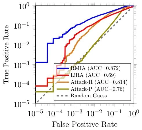 论文提出一种低成本、高性能的鲁棒成员推理攻击(RMIA),解决此前现有成员推理攻击(MIA)计算开销高、低误报率(FPR)下真阳性率(TPR)低、鲁棒性差的问题,为机器学习模型隐私风险审计提供实用工具,聚焦黑盒场景下的参考模型类攻击。