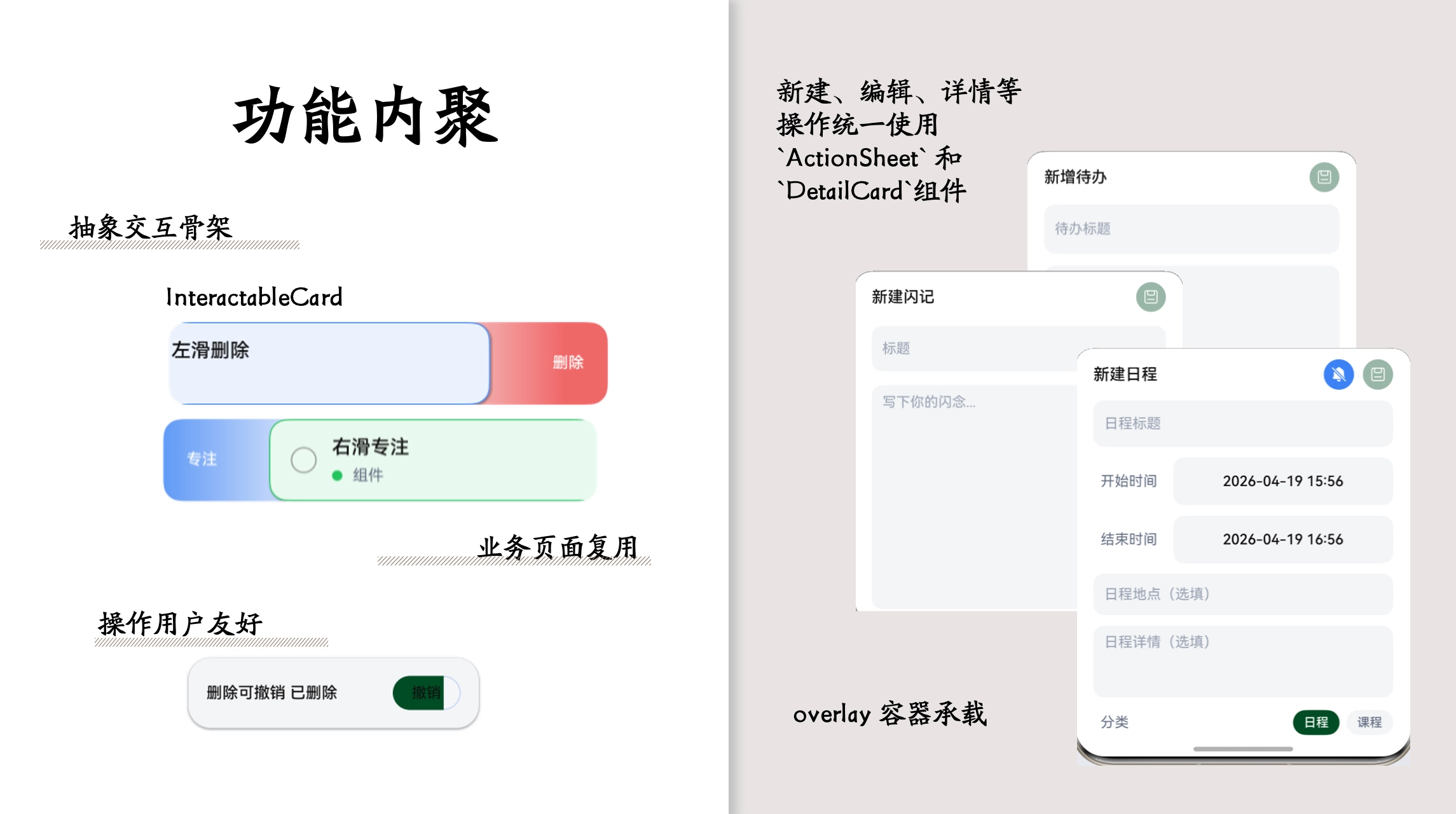 - 桌面组件:利用鸿蒙桌面组件能力,在桌面直接展示日程安排与待办状态,提升触达率。