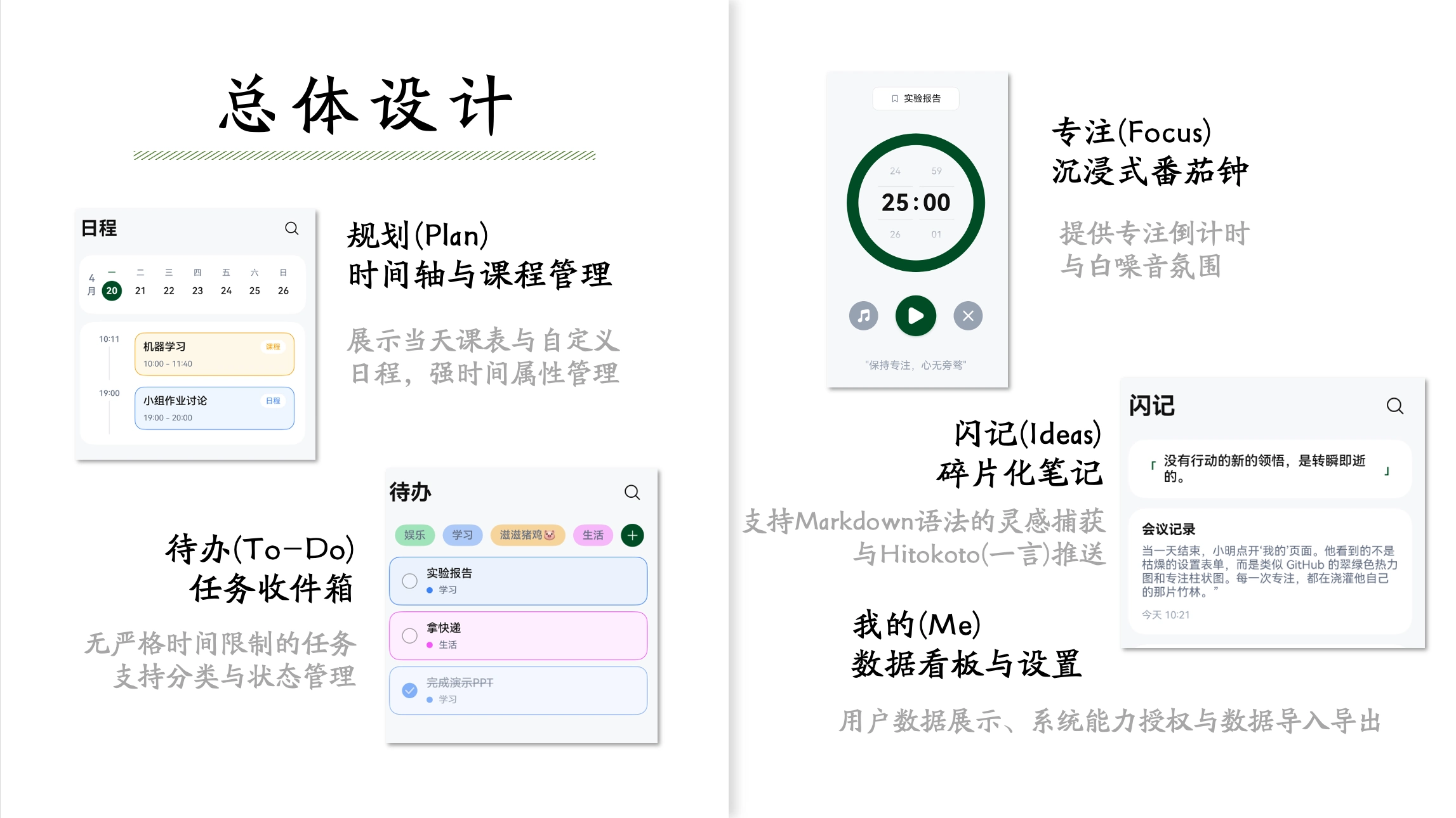 由此可见,我的工作流是割裂的,也时常会面临在多个应用间来回切换的体验。因此我们想:能不能将这些实用的、有助于提高个人生产力的功能集成在一个应用中,不必实现原软件一摸一样的功能,而是确保用户在一个统一的空间内就能完成从计划、执行到复盘的完整流程?这就是「知行 ActHub」的设计哲学:打造一个个人生产力的闭环,让任务与想法在同一空间内自由流转。 我们将应用划分为五大核心场景:「日程 Plan、待办 Todo、专注 Focus、闪记 Idea、我的 User」,每个场景都针对用户在不同阶段的需求进行深度打磨,力求在功能与体验上都能满足用户的期待。