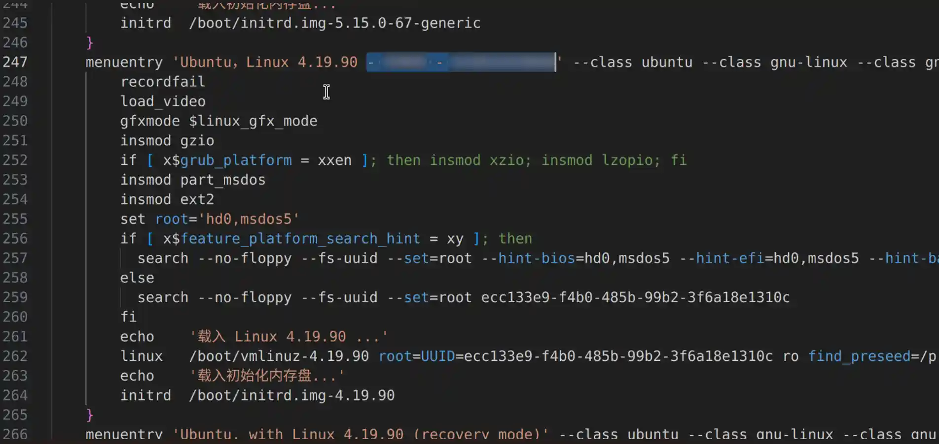 - 修改/boot/grub/grub.cfg 中