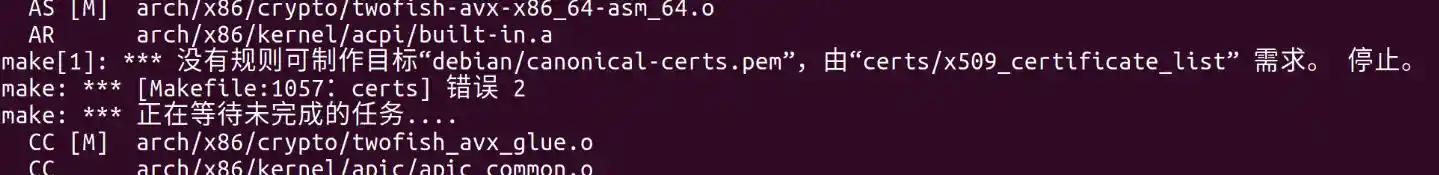 debian/canonical-certs.pem问题,解决方法是注释掉.config文件中的CONFIG SYSTEM TRUSTED KEYS-"debian/canonical-certs.pem"。